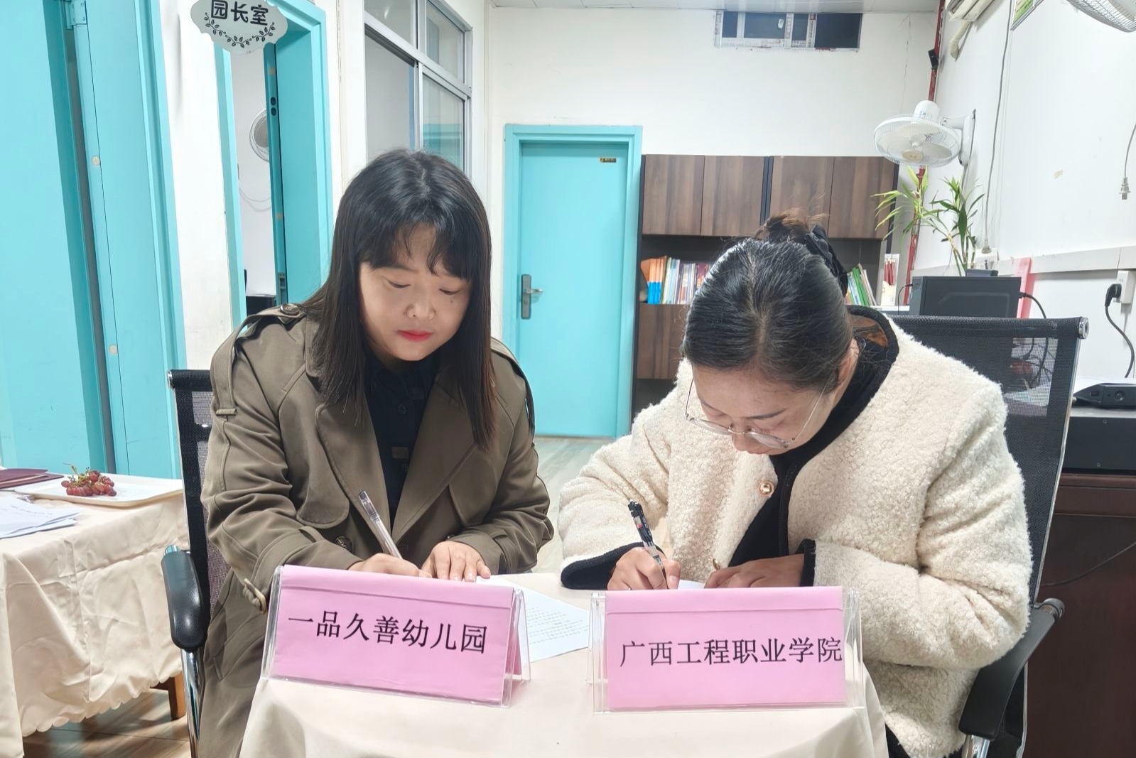 2025年12月5日,广西工程职业学院教育学院与平果市一品久善幼儿园合作签约仪式在幼儿园内顺利举行。双方正式确立合作关系,共同致力于学前教育人才的培养与实践教学的深化。