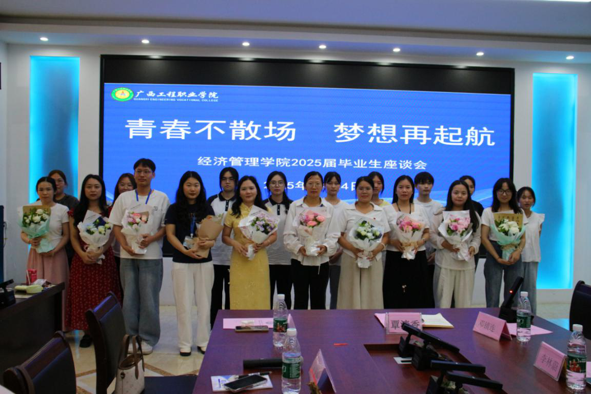 2025年6月24日下午,经济管理学院召开“青春不散场·梦想再启航”2025届毕业生座谈会,学院党支部书记、院长覃清香,分团委书记谢彩英,办公室主任邓镇连,2025届毕业班辅导员,财会专业教师农李菱,电子商务专业教师李林蔚参加此次座谈会,学院来自各个专业的68名毕业生代表与现场的领导老师现场对话,畅谈一路成长与收获,共话学院的改革与发展,展望人生憧憬与未来。