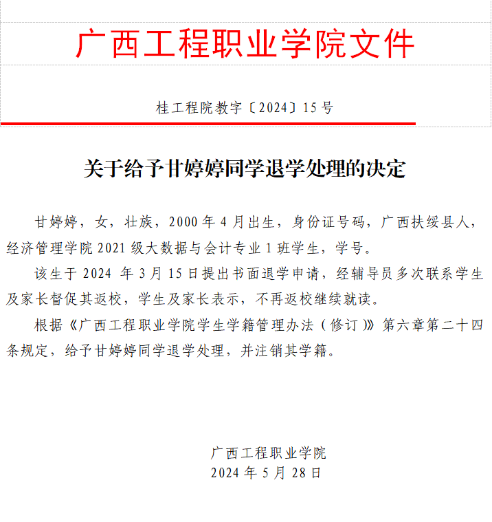 根据《普通高等学校学生管理规定》(教育部令第41号)、《广西工程职业学院学生学籍管理办法(修订)》第二十四条规定,给予甘婷婷同学退学处理,并注销其学籍。