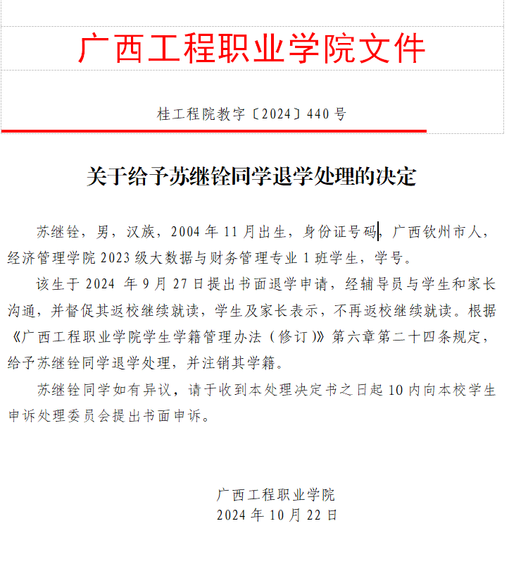 根据《普通高等学校学生管理规定》(教育部令第41号)、《广西工程职业学院学生学籍管理办法(修订)》第二十四条规定,给予苏继铨同学退学处理,并注销其学籍。