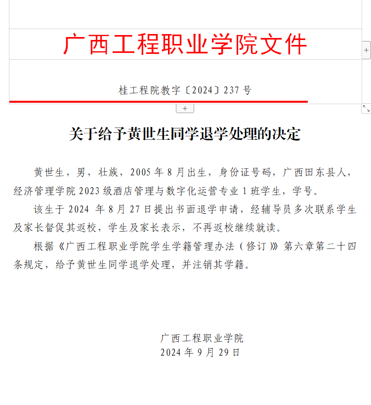 根据《普通高等学校学生管理规定》(教育部令第41号)、《广西工程职业学院学生学籍管理办法(修订)》第二十四条规定,给予黄世生同学退学处理,并注销其学籍。