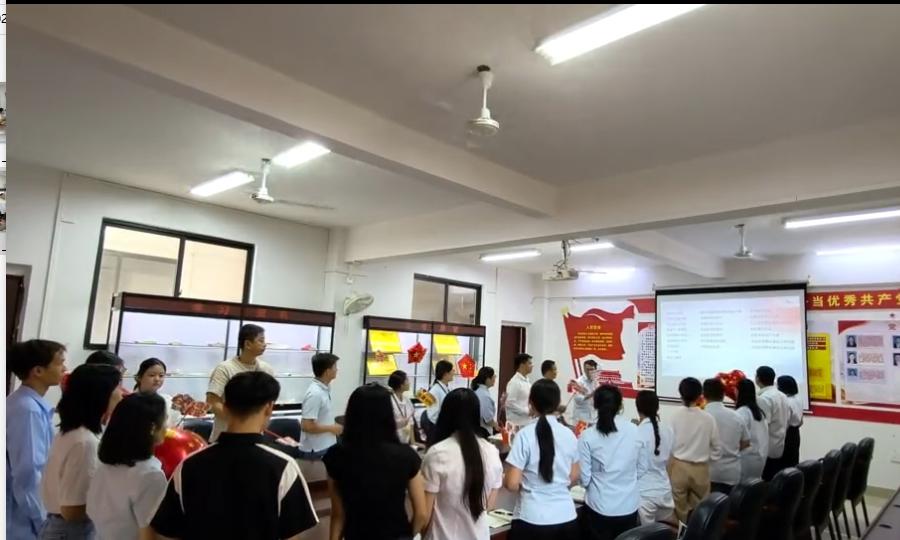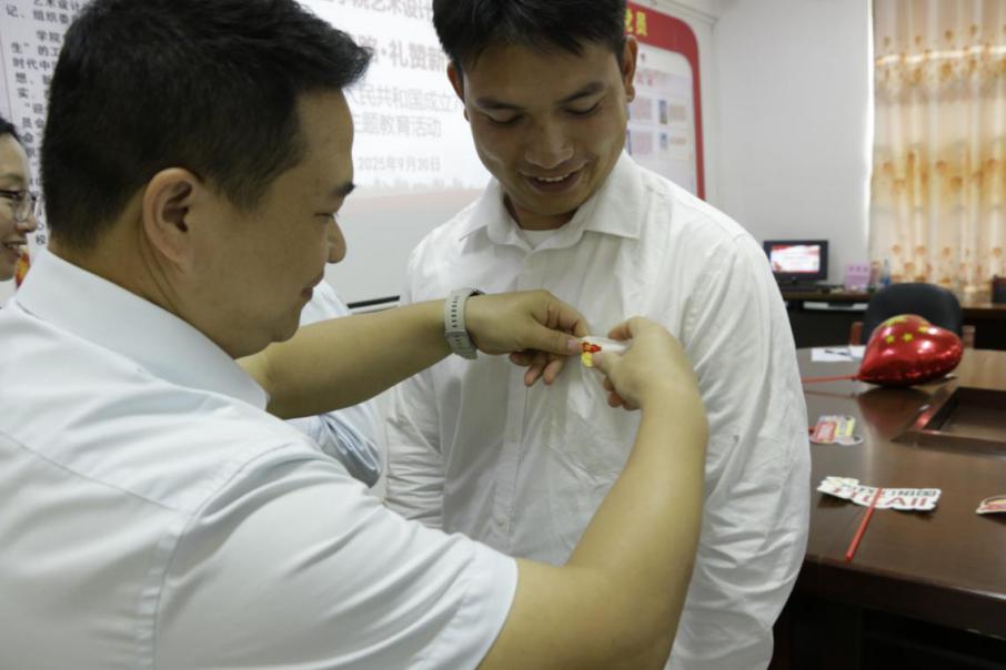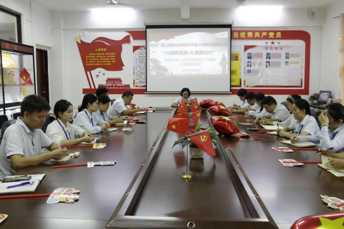 2025年9月30日下午,艺术设计学院党支部在学院三楼党员活动室开展了“76载辉煌路·礼赞新时代”庆祝中华人民共和国成立76周年主题教育活动。学院全体教师参加本次主题教育活动,活动由党支部书记覃凤姣同志主持,本次会议包含党支部书记讲党课、老党员给新党员佩戴党员徽章、党支部书记领誓、同唱红歌等四个环节。