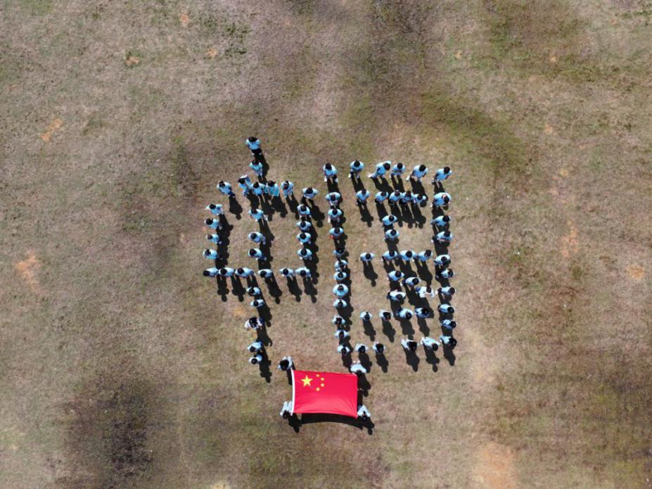 图为学生在校内田径场内默契配合摆出“中国”字样