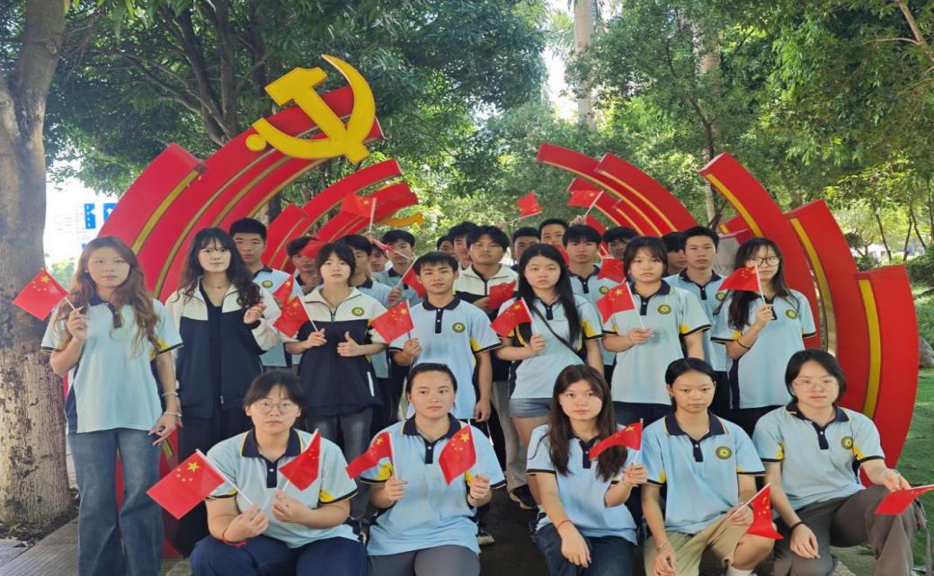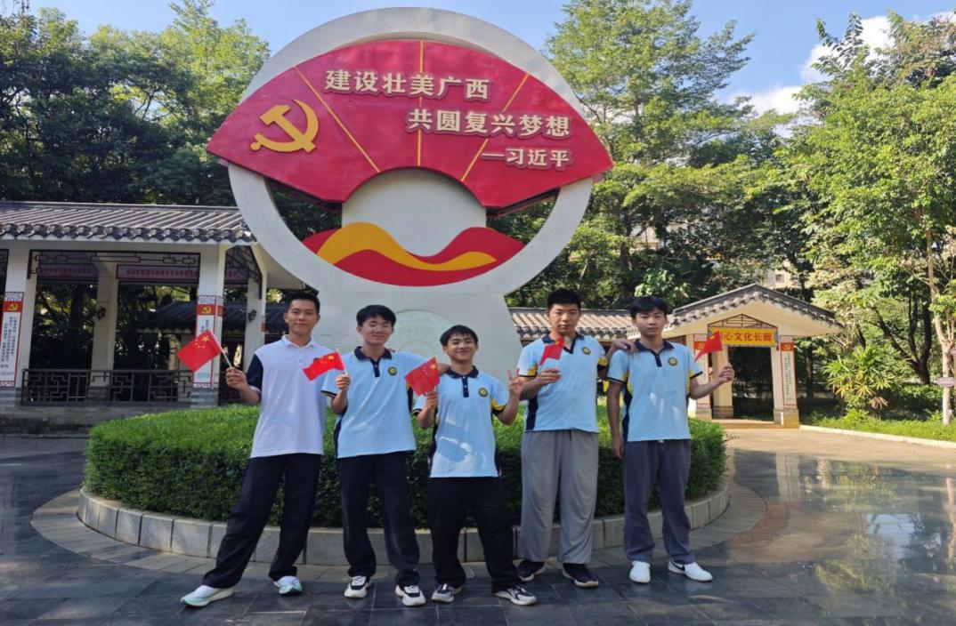 图为2024级美容美体艺术1班与平果市红色文化地标合影