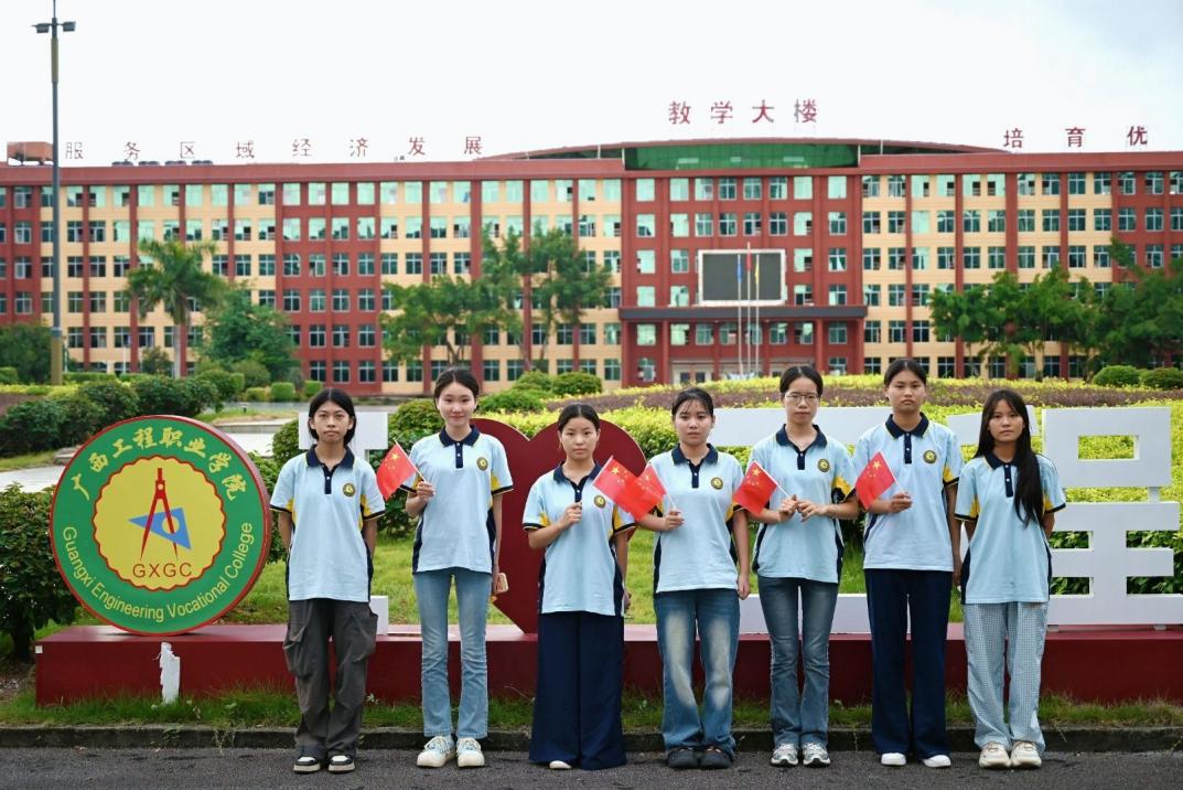 校园内外的双节景致同样成为学子们的“创作素材”。如校内田径场内默契配合摆出“76”与“中国”字样,无人机升空盘旋,将这一饱含敬意的画面定格,红色身影与蓝色天空相映,成为献给祖国的独特贺礼;2024级广告艺术设计1、2班的同学们手持鲜艳国旗,穿梭于鲁班广场与西门“Love工程”地标;2024级产品艺术设计1班聚焦“我眼中的国庆”,漫步街头捕捉红色元素——商铺前飘扬的国旗、路灯上悬挂的双节装饰、广场里的国庆主题布置,每一张照片都藏着城市对家国的祝福;2024级美容美体艺术1班则走进邓公山、平果人民政府等地,与红色文化地标合影,在感受祖国发展变迁的同时,也以特殊方式为双节“打卡”,让家国情怀在实地探访中愈发深刻。