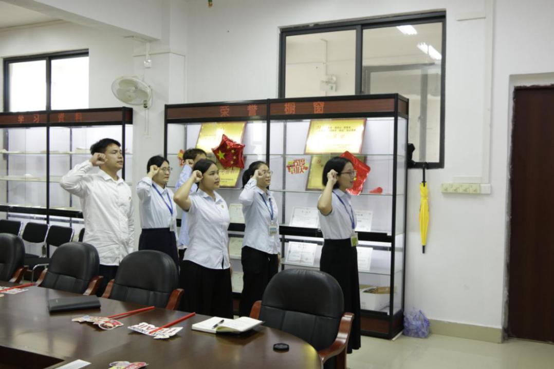 图为党支部书记覃凤姣同志带领新党员教师宣誓