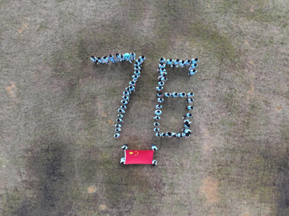 图为学生在校内田径场内默契配合摆出“76”字样