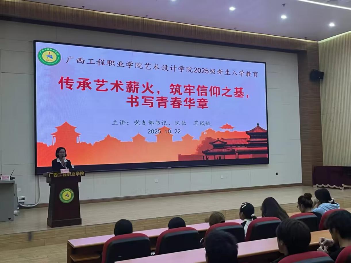 10月22日,艺术设计学院党支部书记、院长覃凤姣为全体新生带来“传承艺术薪火,筑牢信仰之基,书写青春华章”专题讲座,增强新生对学院的认同感与归属感,激发爱国爱校情怀。