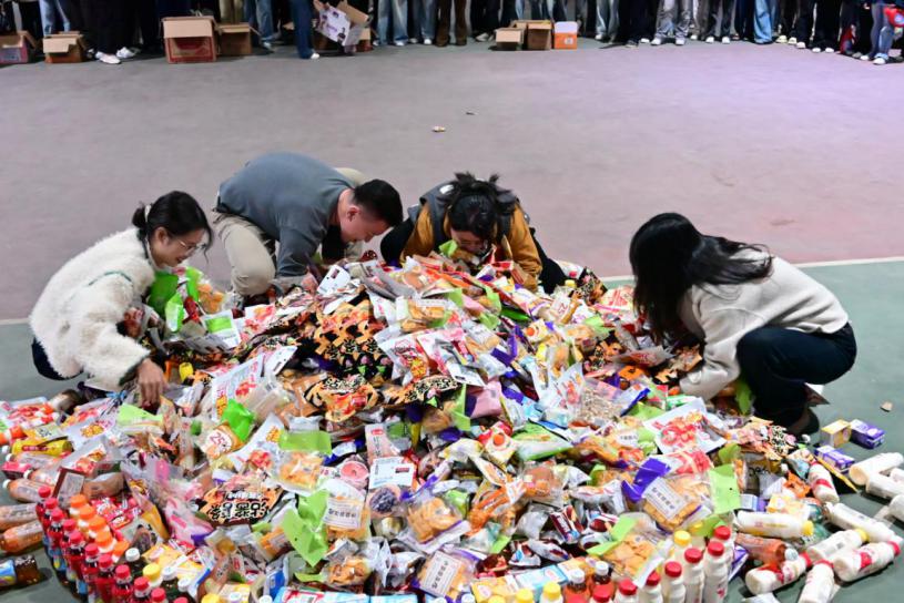 最后压轴的零食大作战,更是将现场氛围彻底推向高潮。第一轮,辅导员和专任教师代表们摇身一变成为“物资搬运员”,在3分钟内往返冲刺,为班级抢夺美味零食。第二轮,学生代表队各5名同学登场接力,严格遵循“前一人归队后一人出发”的规则,上演了一场活力四射的竞速较量,为班级赢回满满当当的“战利品”。