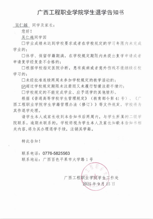 吴仁越,男,学号:202447020041,艺术设计学院2024级广告艺术设计2班学生;于2025年8月31日开学至今未返校,超过学校规定期限未注册而又未履行暂缓注册手续,对老师的提醒亦不回复,经多次联系其本人及其家人均无果。学校于2025年9月16日邮寄退学告知书,因不是学生本人及其家人签收,处理告知书无法以直接送达、留置方式、邮寄方式送达本人。根据《普通高等学校学生管理规定》(教育部令第41号)、《广西工程职业学院学生学籍管理办法(修订)》规定,现通过广西工程职业学院艺术设计学院官网予以公告,公告时间为2025年9月26日至2025年10月25日,公告期满,即视为送达。
