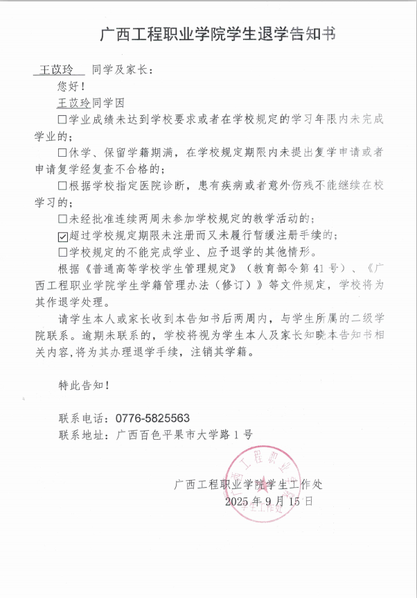 王苡玲,女,学号:202466020055,艺术设计学院2024级建筑室内设计2班学生;于2025年8月31日开学至今未返校,超过学校规定期限未注册而又未履行暂缓注册手续,对老师的提醒亦不回复,经多次联系其本人及其家人均无果。学校于2025年9月16日邮寄退学告知书,因不是学生本人及其家人签收,处理告知书无法以直接送达、留置方式、邮寄方式送达本人。根据《普通高等学校学生管理规定》(教育部令第41号)、《广西工程职业学院学生学籍管理办法(修订)》规定,现通过广西工程职业学院艺术设计学院官网予以公告,公告时间为2025年9月30日至2025年10月29日,公告期满,即视为送达。
