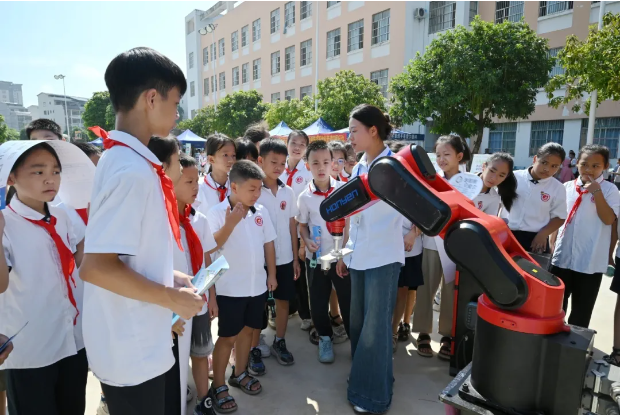 工业机器人展区俨然成为小学生们的 “科技乐园”。专业教师与学生志愿者带领孩子们开展“机器人小互动”活动,让孩子们在趣味体验中感受工业机器人的科技魅力。
