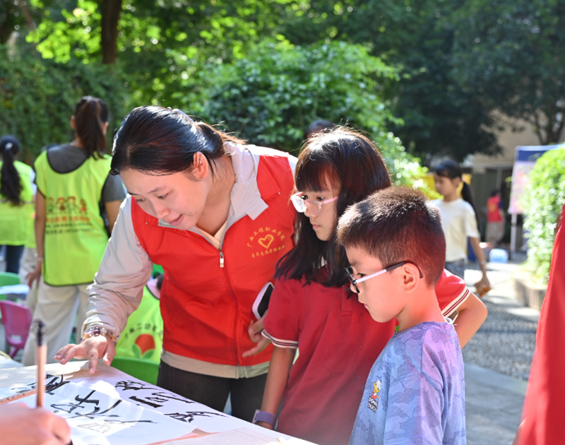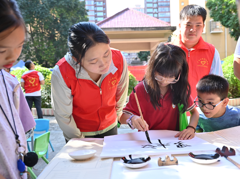 书法传情活动现场,志愿者们耐心指导社区居民挥毫泼墨,孩子们在旁认真观摩学习,墨香与书香交织,传统文化在互动中传承,志愿温情浸润人心。