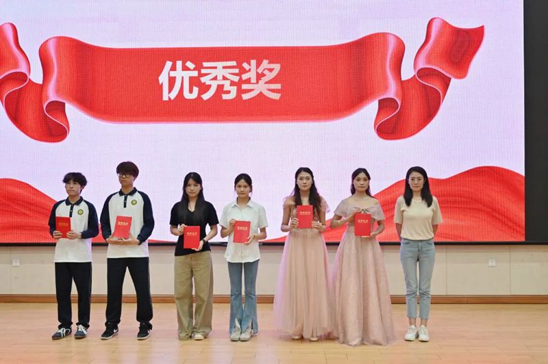 图为教务处凌玲老师为荣获“优秀奖”的同学颁发荣誉证书