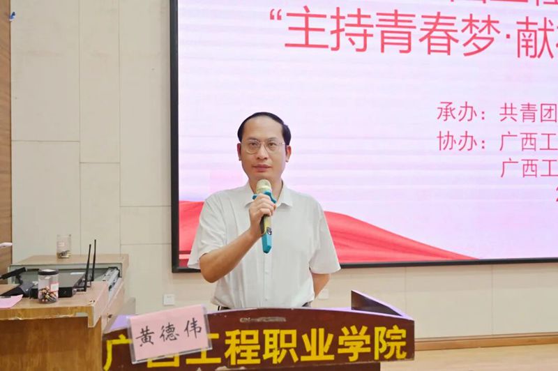 副校长黄德伟致辞,他指出,语言是传递思想的载体,主持是连接心灵的桥梁。良好的语言表达、临场应变与综合素养,是新时代高校学子立身求学的基础、担当作为的底气。本次大赛不仅是校园文化生活的丰富升级,更是学校挖掘青年人才、培育综合素质、弘扬时代新风的重要举措,为同学们搭建了展示自我、锤炼自我、超越自我的宝贵平台。