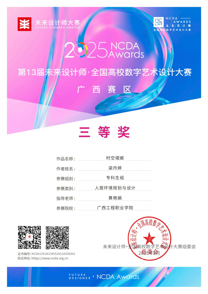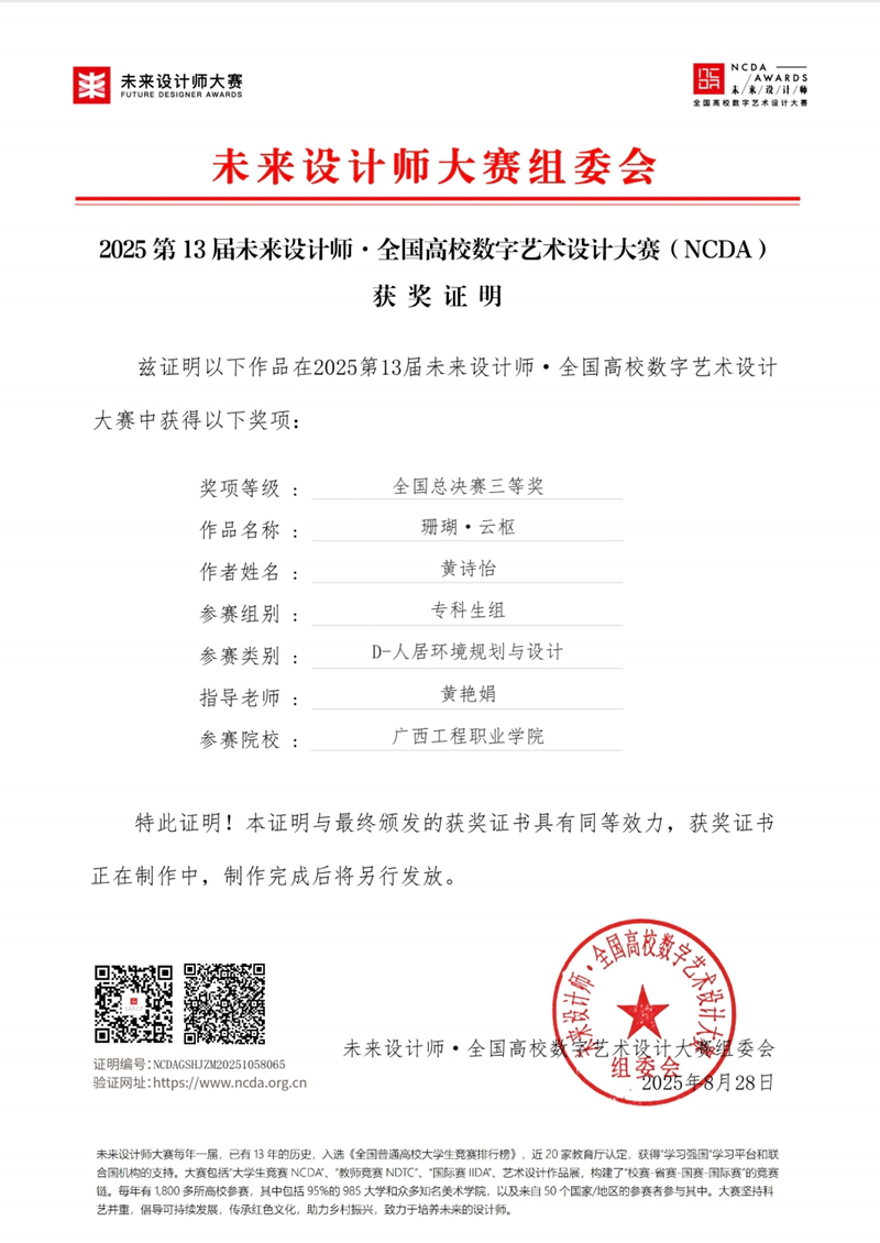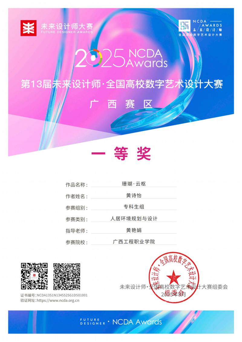 2025 年第 13 届 “未来设计师・全国高校数字艺术设计大赛”(NCDA)评选结果揭晓。广西工程职业学院艺术设计学院学子表现优异,共斩获全国总决赛三等奖 1 项,广西赛区一等奖 1 项、二等奖 1 项及三等奖 2 项;黄艳娟、谭雪融两位教师获评 “优秀指导教师”。