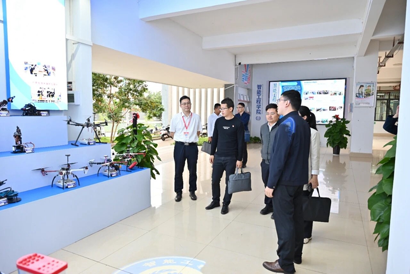在孙登林副校长及相关职能部门负责人的陪同下,我校一行先后参观了广西城市职业大学学研产职校区的制造融合创新中心、汽车智能技术研究中心、知识产权与创新中心、中外语言文化实训中心及教育学院学研产职综合实训基地等多个实训场所。参观过程中,各实训中心负责人详细介绍了实训室的建设规划、设备配置、教学运行管理及产教融合实训项目的开展情况。我校教学团队认真聆听讲解,仔细观摩实训设备操作流程,并不时与现场教师、实训管理人员深入交流,重点探讨了实训室在课程对接、技能培养、校企合作、AI赋能教学等方面的创新举措,现场还观看了无人机在农业、文旅领域的应用演示。