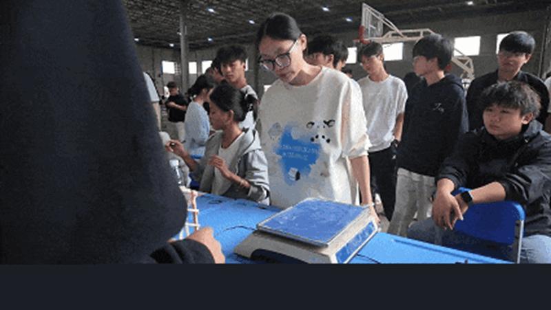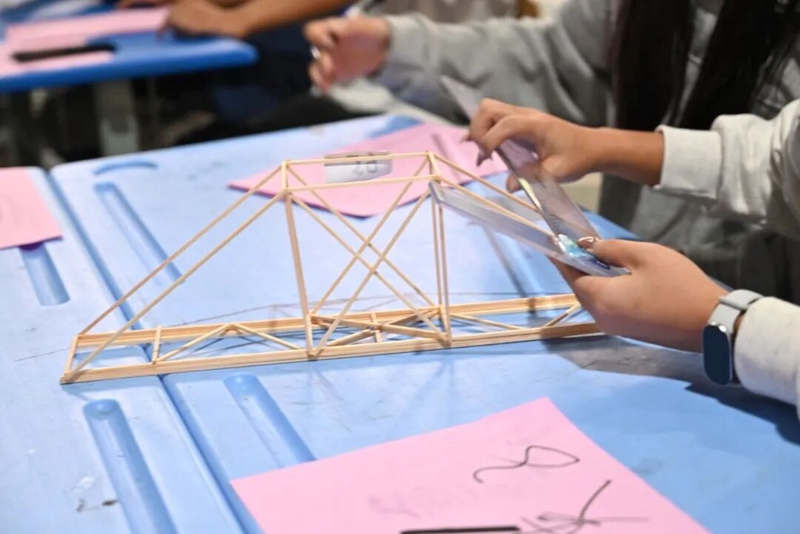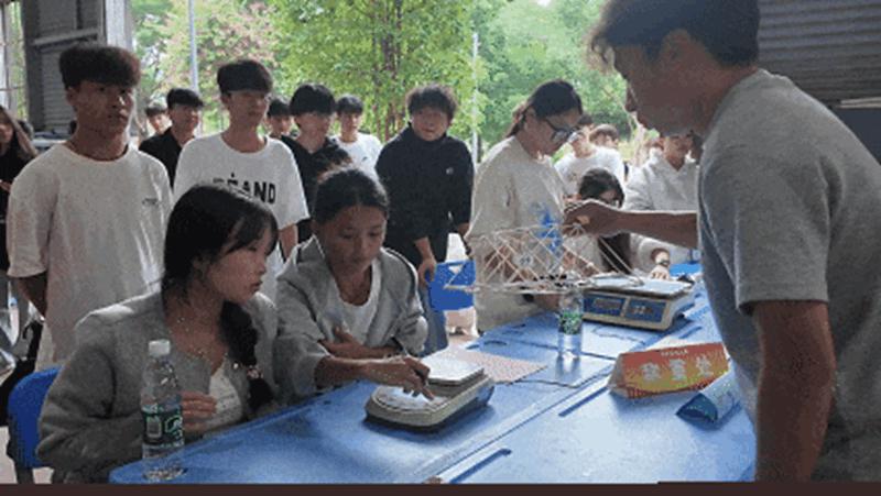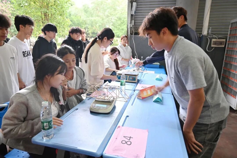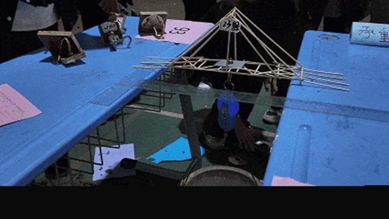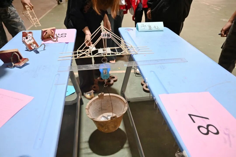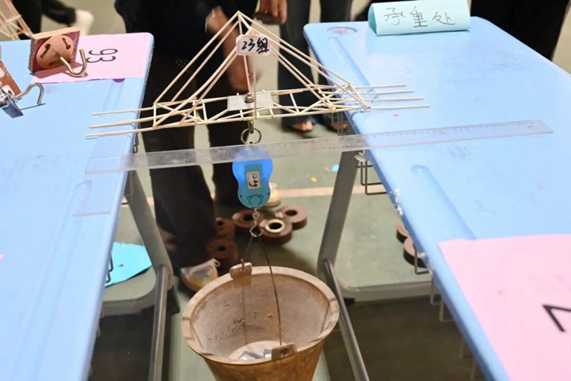 选手们的模型通过挂钩、秤砣进行荷载测试,蓝色测力计实时记录承重数据,每一次数值跳动都牵动全场目光,考验结构稳定性与力学设计功底。
