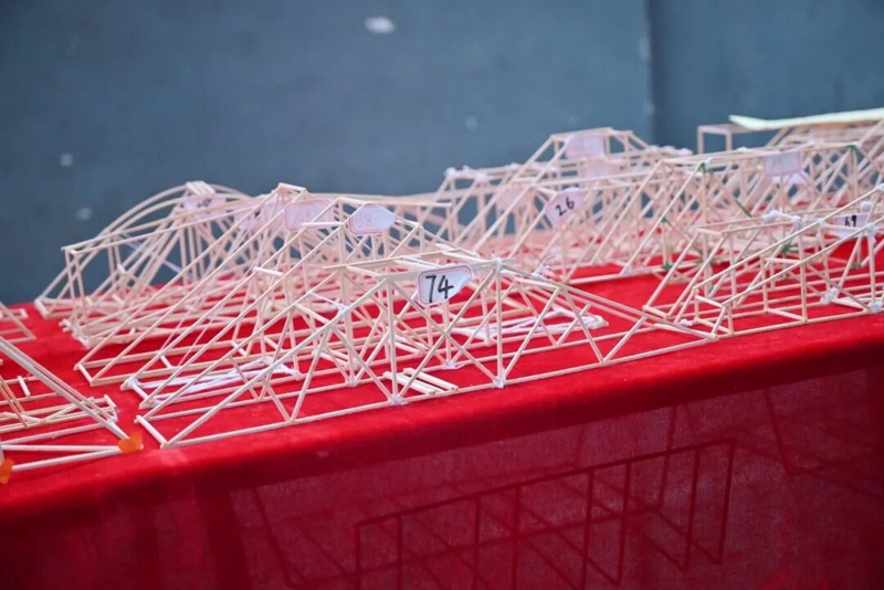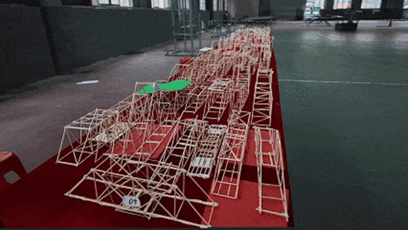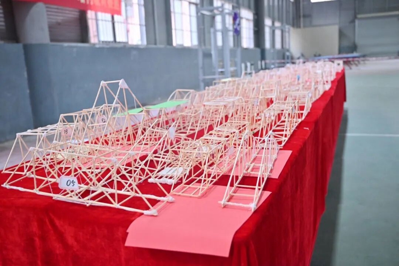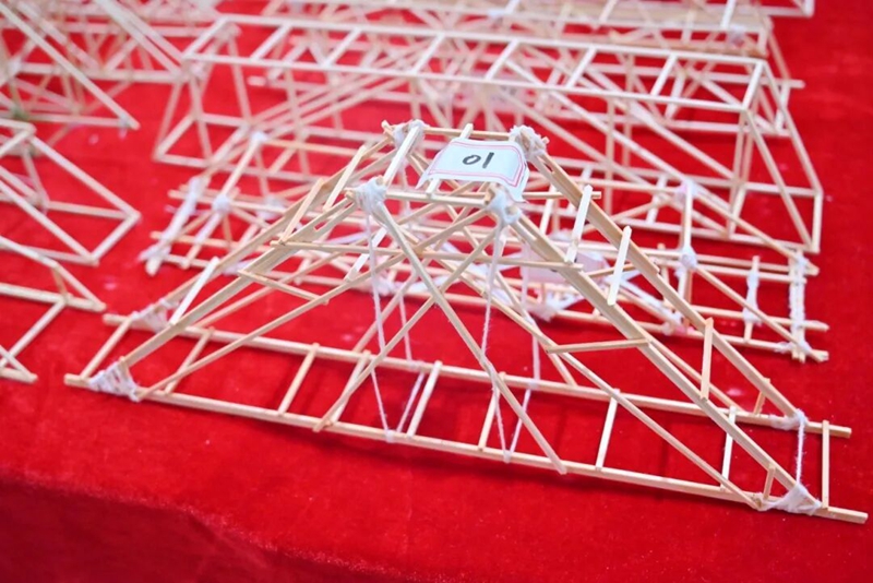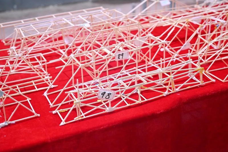 百余组结构模型在红色展台上整齐排列,选手们以松木条、502胶水精心搭建出各类桁架、框架结构,编号清晰、设计多元,每一件作品都是工程思维与手工技艺的结晶。