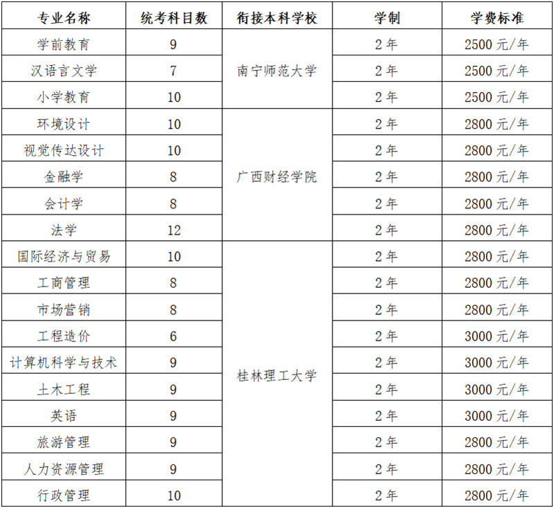 我校立足于社会发展需求与学生职业发展导向,重磅携手南宁师范大学、广西财经学院、桂林理工大学等多所优质本科院校,建立深度战略合作。这些院校及相关专业均经过严格评估,与学校现有专业体系高度契合。我们强强联合,旨在为学生搭建与我校专业无缝衔接的优势本科专业,只为提供一条高匹配度、高含金量的本科进阶通道。