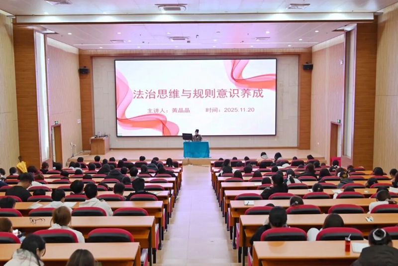 图为学生科长黄晶晶作《法治思维与规则意识养成》专题培训