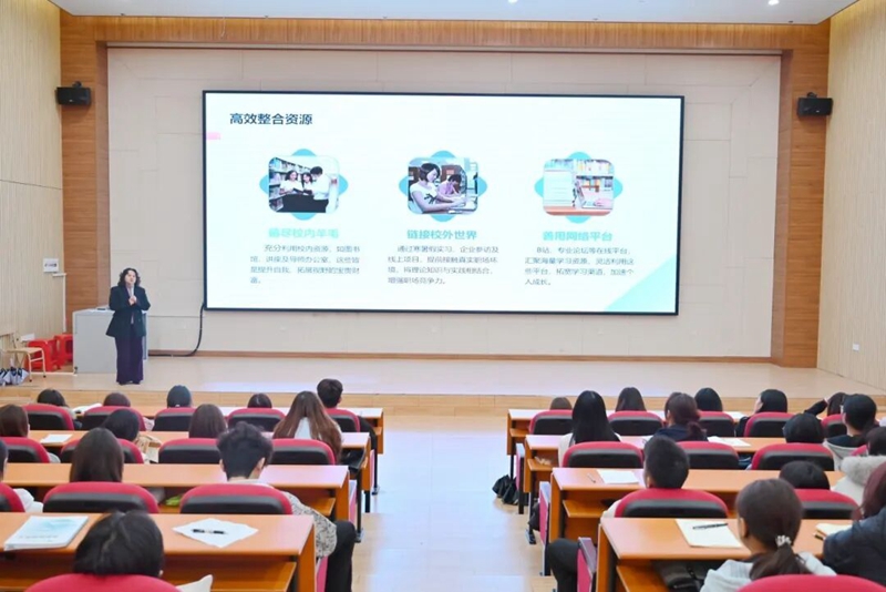 图为办公室主任农淑娟作《大学生学业规划》专题培训