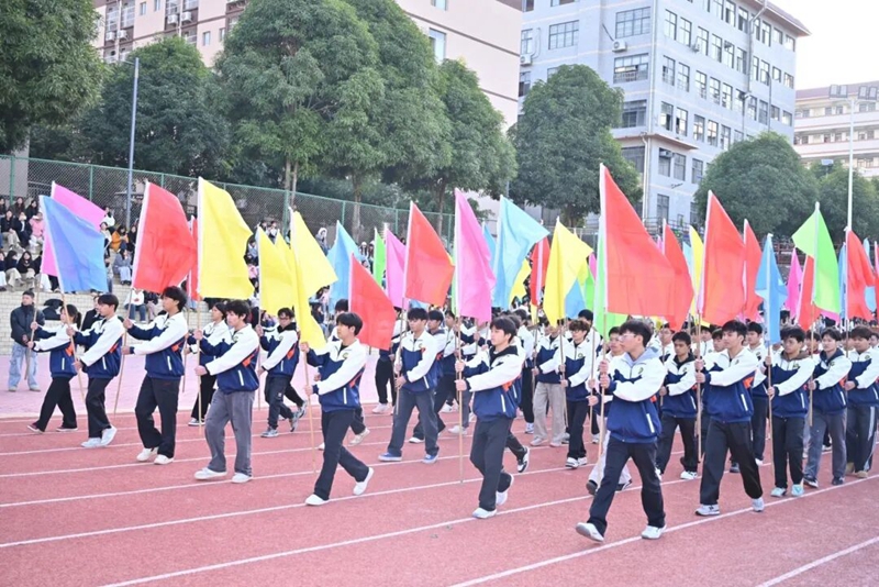 彩旗迎风飘扬,红色代表热忱,蓝色象征坦荡,黄色寓意希望,绿色展现生机,橙色点燃奋进。这是校园风貌的生动写照,凝聚着全校师生的同心与朝气。
