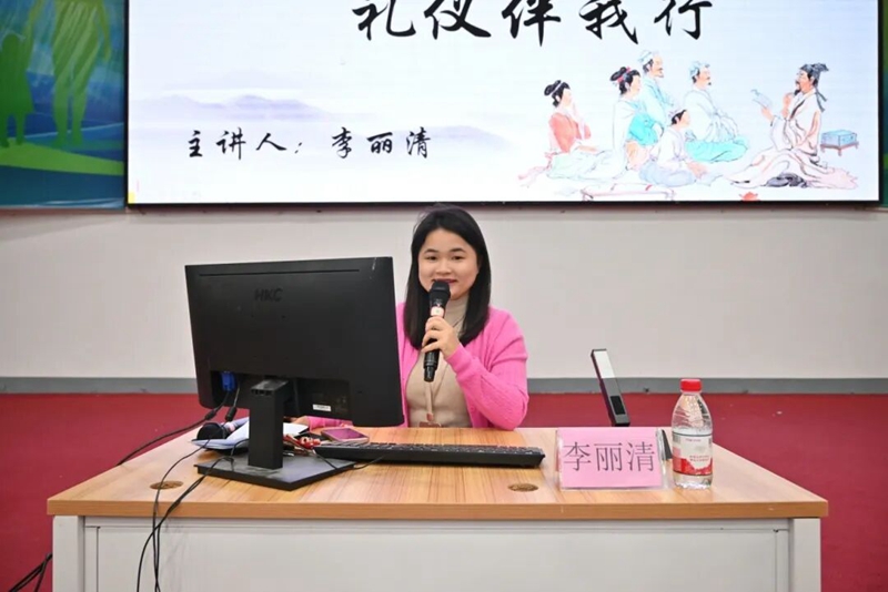 图为团委副书记李丽清作《文明礼仪伴我行》专题教育