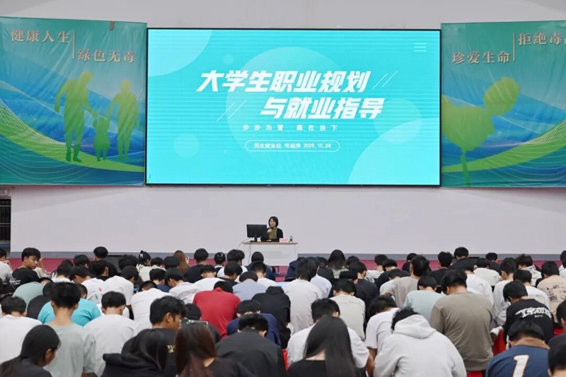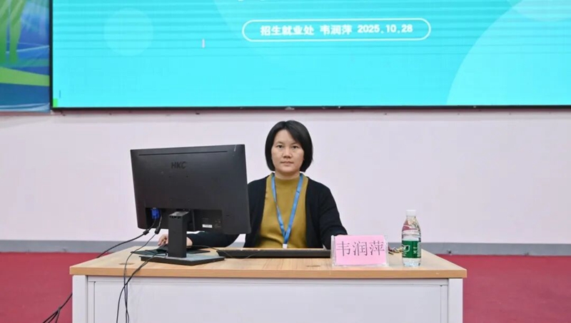 图为招生就业处科长韦润萍主讲《大学生就业指导》专题教育,她结合大量典型就业案例,对当前就业市场形势展开全面且深入的剖析。专题教育不仅解读了热门行业的发展动态与趋势走向,还详细阐述了不同岗位所需的核心技能与综合素养,内容凝练实用、干货满满,让在场学子受益匪浅。