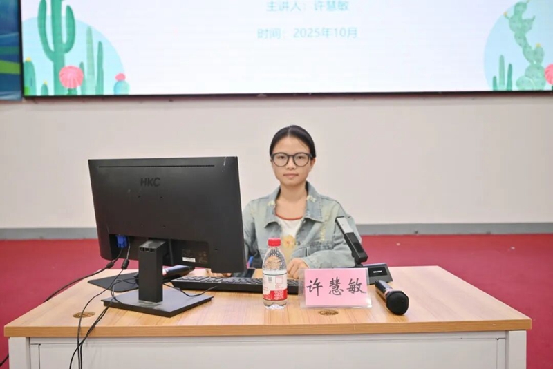 图为心理健康教师许慧敏作《大学生心理健康教育》专题教育