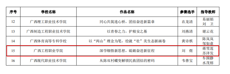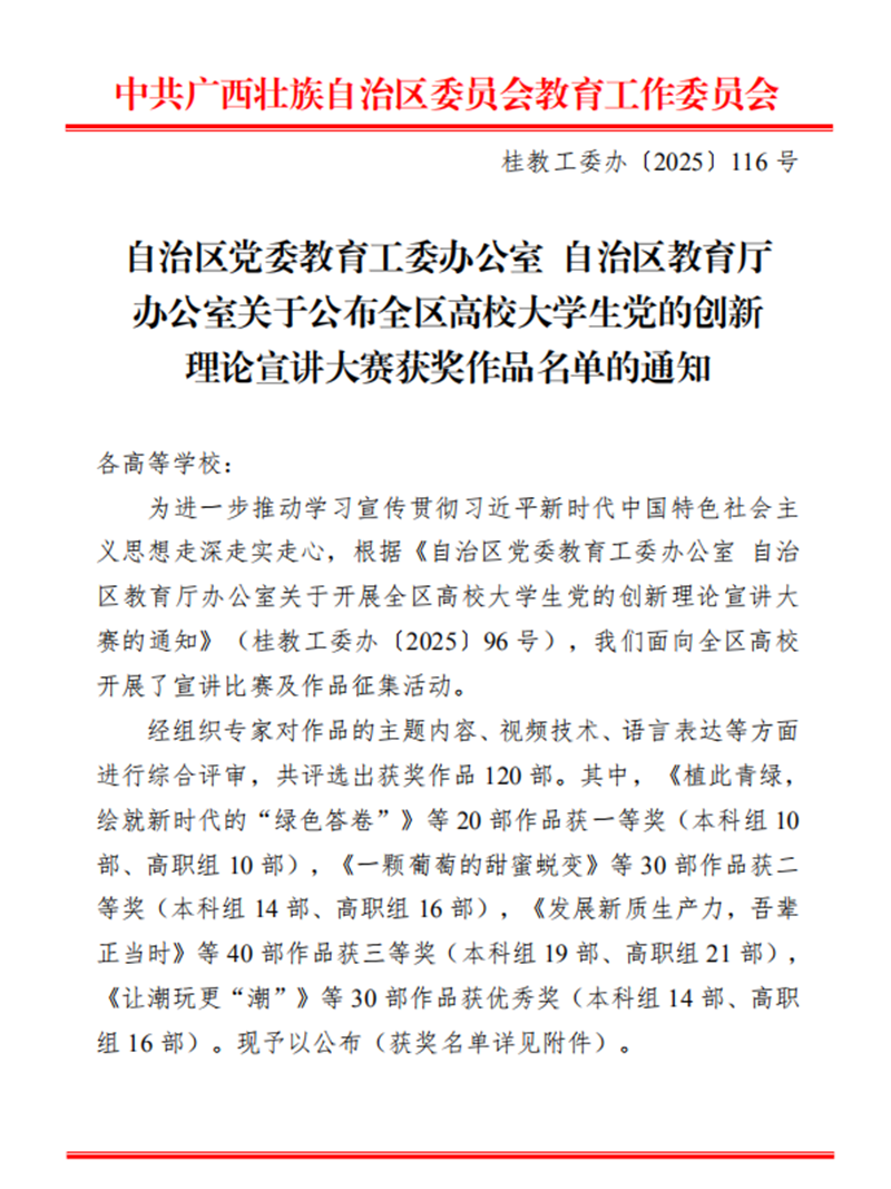 为推动学习宣传贯彻习近平新时代中国特色社会主义思想走深走实走心,自治区党委教育工委、自治区教育厅组织开展了全区高校大学生党的创新理论宣讲大赛。经过专家对作品主题内容、视频技术、语言表达等多方面进行综合、严苛评审,我校刘煜同学的宣讲作品《深学细悟新思想,砥砺奋进新征程》凭借鲜明的主题、真挚的情感和生动的表达,成功斩获高职组优秀奖!此次获奖,既是对刘煜同学宣讲能力与理论素养的充分肯定,也彰显了我校在思想政治教育工作中的扎实成效。