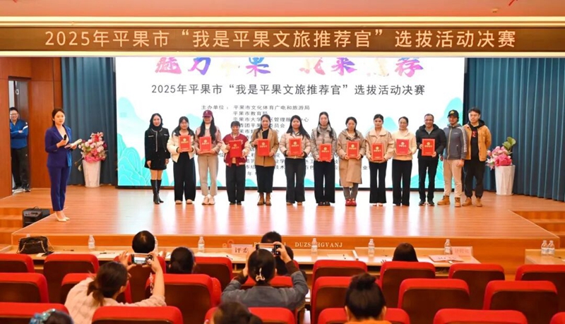 颁奖环节中,嘉宾为获奖学子颁发荣誉证书,见证荣耀时刻,也寄语所有选手以此次活动为契机,让世界听见平果的声音,看见平果的风景,爱上平果的山水人文!成为平果文旅故事的传播者、文旅魅力的代言人!