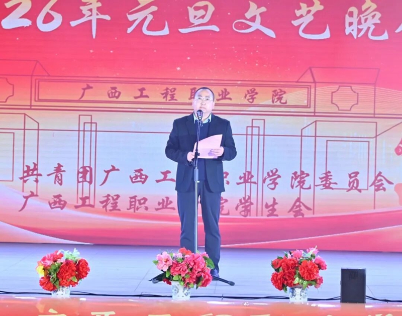 纪委书记、副校长彭高彬致辞。他代表学校党委和行政班子,祝贺广西工程职业学院“同心贺元旦·聚力谱华章”2026年元旦文艺晚会隆重举行,向全体教职员工、全体同学,以及关心支持学校发展的校友和社会各界朋友致以新年问候与衷心感谢。