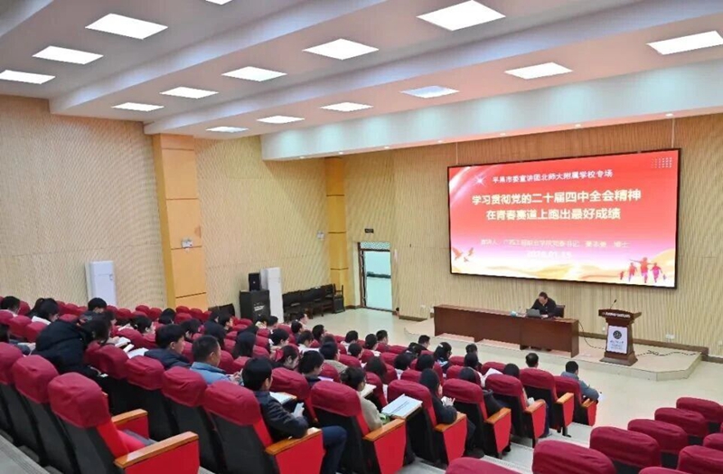 为推动党的创新理论深入校园、深入人心,引导广大教师党员深刻领会、准确把握党的二十届四中全会精神的核心要义与实践要求,2026年1月15日,平果市委宣讲团成员,广西工程职业学院党委书记、政府督导专员蒙本曼走进北京师范大学平果附属学校,以《学习贯彻党的二十届四中全会精神,在青春赛道上跑出最好成绩》为题,为该校教师作了一场深刻而富有感染力的专题宣讲报告。
