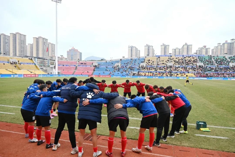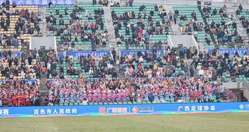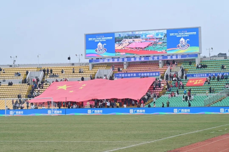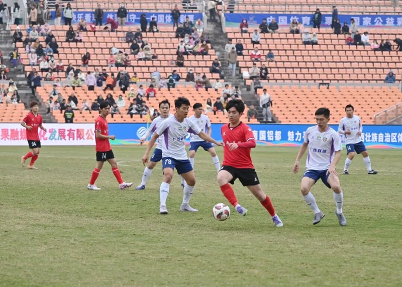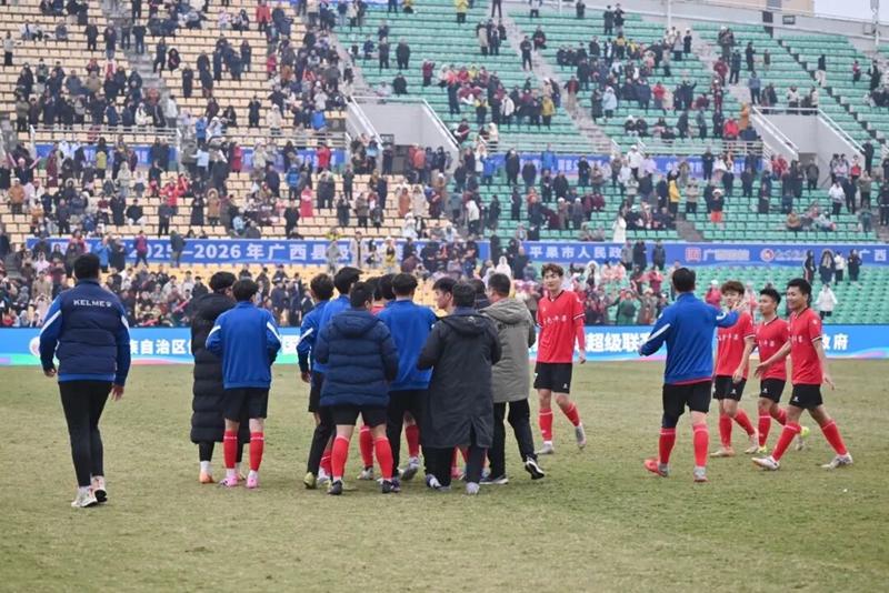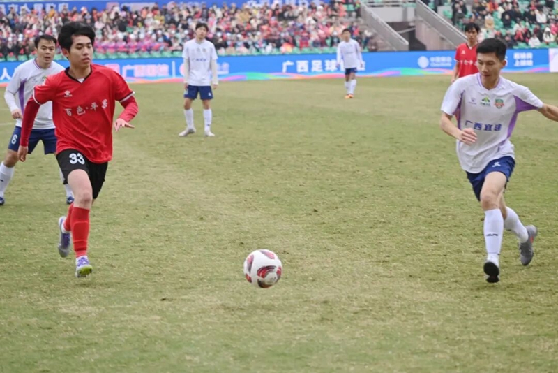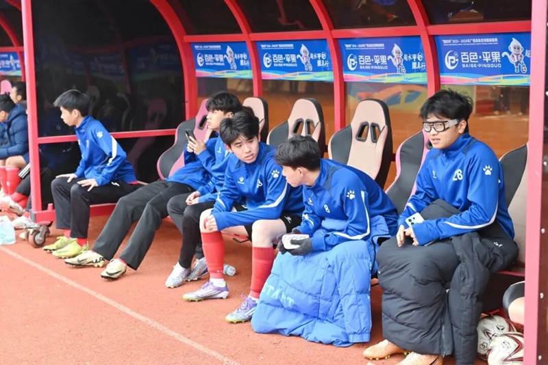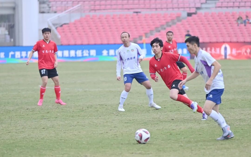 赛前的平果国晶体育场氛围热烈,万名球迷汇聚于此,极具民族风情的暖场表演点燃全场热情。我校 4 名参赛学子斗志昂扬,早早投入赛前热身,邓锦斌同学更是首发出战,肩负期待踏上绿茵场;黄彬、蒙萌、李镇全三位同学则在替补席严阵以待,随时准备为团队助力。