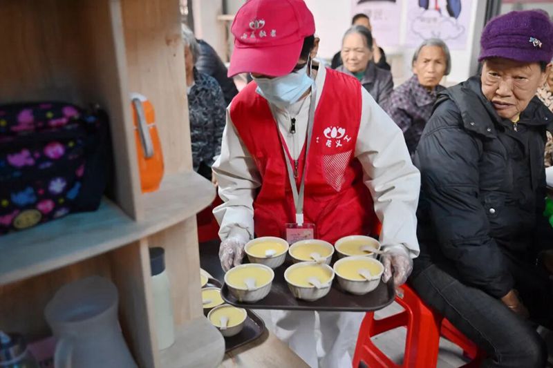 欢声笑语间,午饭时间悄然临近,志愿者们立刻化身 “后勤小帮手”,齐心协力将粥、米饭、菜品细心端上二楼。两名志愿者专门负责打米粥,将米粥盛入小碗,整整齐齐摆放在餐桌之上,为老人们的用餐做好充分准备。
