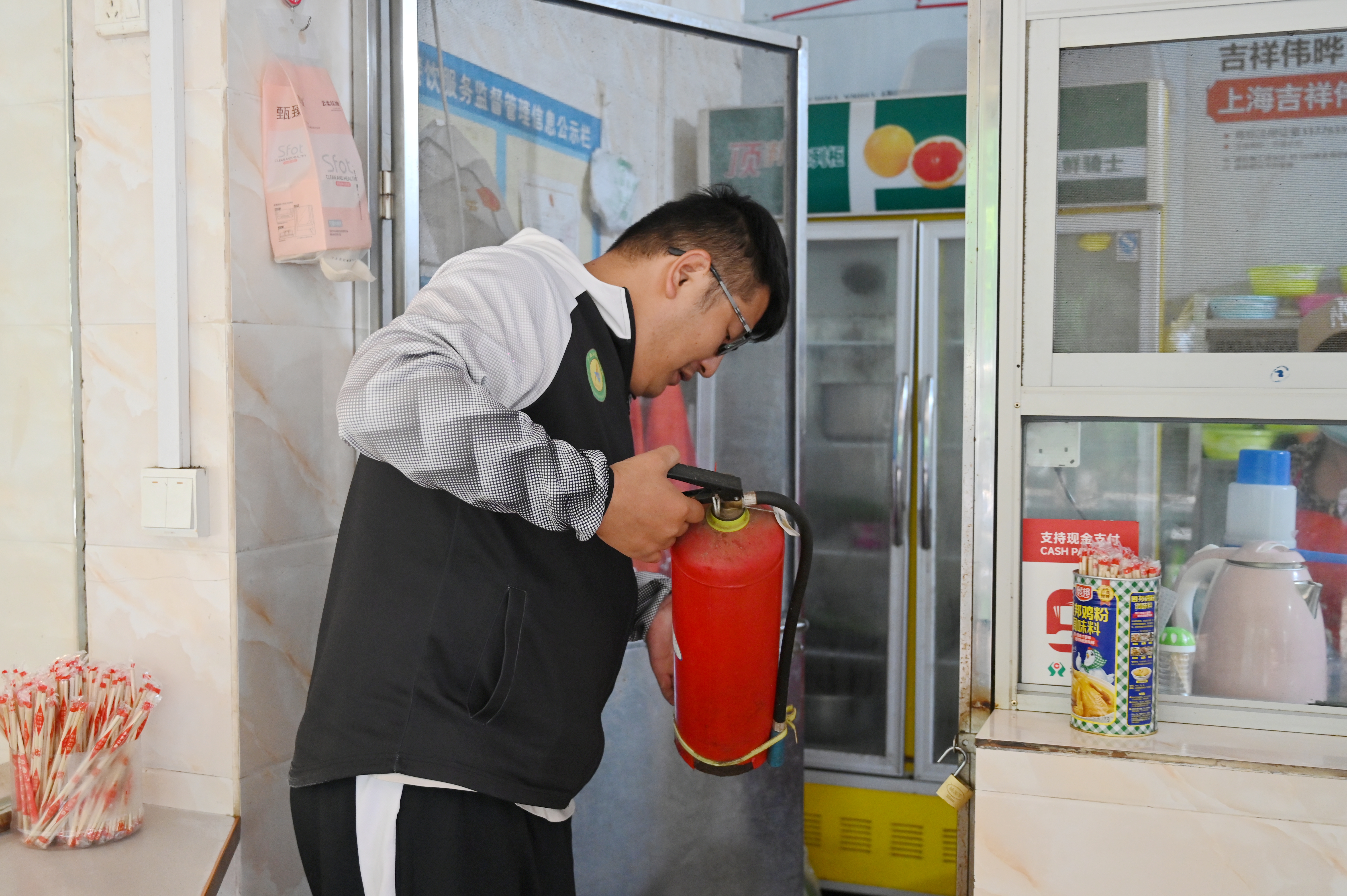 针对日常防火,刘主任要求严格执行"三到位":每日检查燃气阀门、电器线路;每周清理灶台油垢;每月配合全面巡检。油烟管道必须严格按周期清洗,严格设置防火阀。在消防设施使用方面,他重点讲解了灭火毯的覆盖方法和干粉灭火器"提、拔、握、压"口诀,强调保持安全距离和断电优先原则。