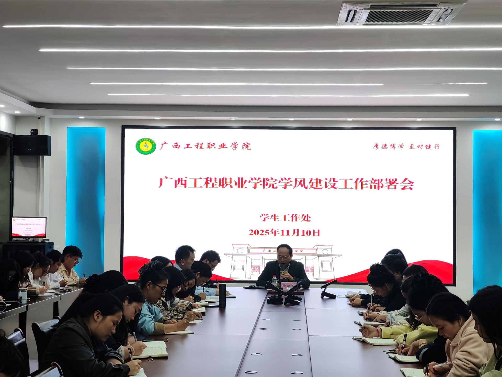 为弘扬我校优良学风,引导学生树立远大理想,端正学习态度,明确学习目的。2025年11月10日我校学生工作处组织召开广西工程职业学院学风建设工作部署会。